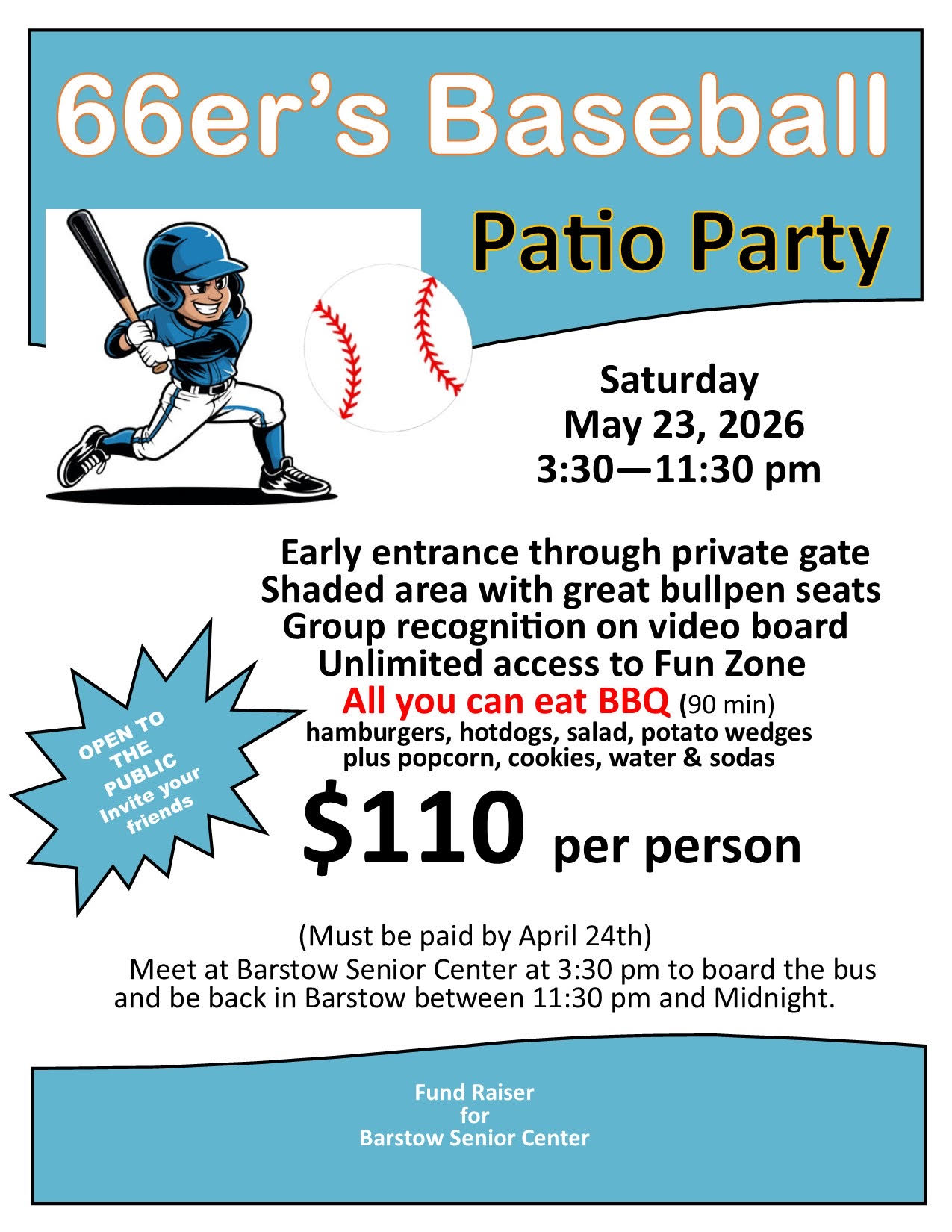Batter up for a fun day at the ballpark! Join the Barstow Senior Center for a special 66ers Baseball Patio Party on Saturday, May 23, 2026. Guests will enjoy early entry through a private gate, shaded bullpen seating, group recognition on the video board, unlimited access to the Fun Zone, and an all-you-can-eat BBQ meal. […]